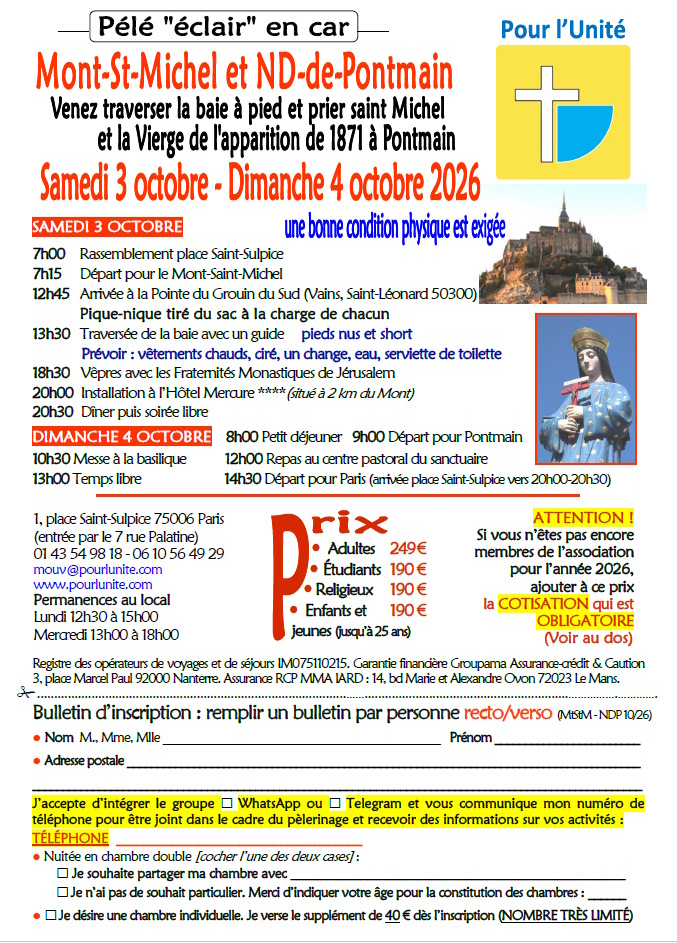 Si vous désirez faire plusieurs des pèlerinages qui vous sont proposés, merci d’établir un chèque distinct par pèlerinage.