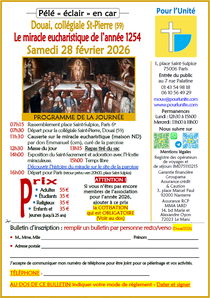 Le pèlerinage est complet au 28 janvier. Une liste d’attente est ouverte. N’hésitez pas à nous joindre si nécessaire pour tout renseignement : 0143549818 ou mouv@pourlunite.com