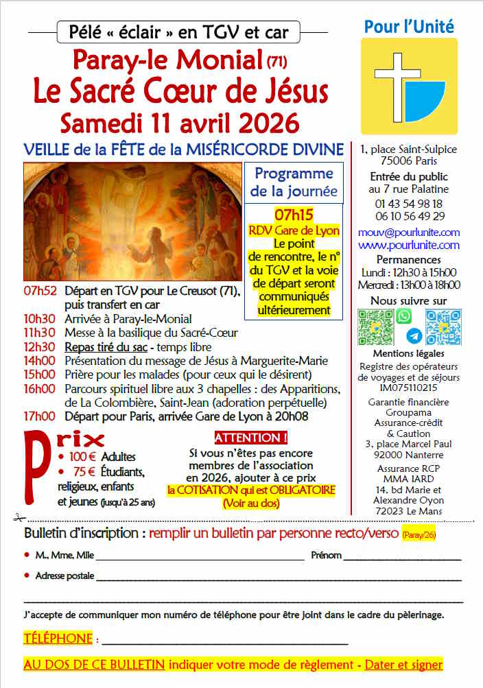Si vous désirez faire plusieurs des pèlerinages qui vous sont proposés, merci d’établir un chèque distinct par pèlerinage.
