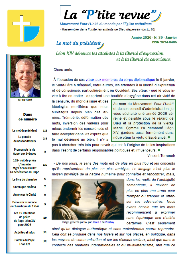 Au nom du Mouvement Pour l’Unité et de son conseil d’administration, je vous souhaite une année 2026 sereine et paisible sous le regard de Dieu et la protection de la Vierge  Marie. Comme l’a demandé Léon XIV, gardons aussi fermement dans notre cœur la vertu d’Espérance.